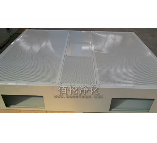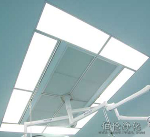 层流送风天花静压箱采用电解镀锌钢板表面喷漆处理或不锈钢加工,四边采用硅胶密封,形成一个气密箱体;HEPA过滤器采用佰伦99.999%@0.3μm过滤器,安装在静压箱内,且能从天花下面进行维修;送风天花表面采用纱网框,它是一种特殊系数的阻尼网层,使空气垂直地送到手术室主流区。